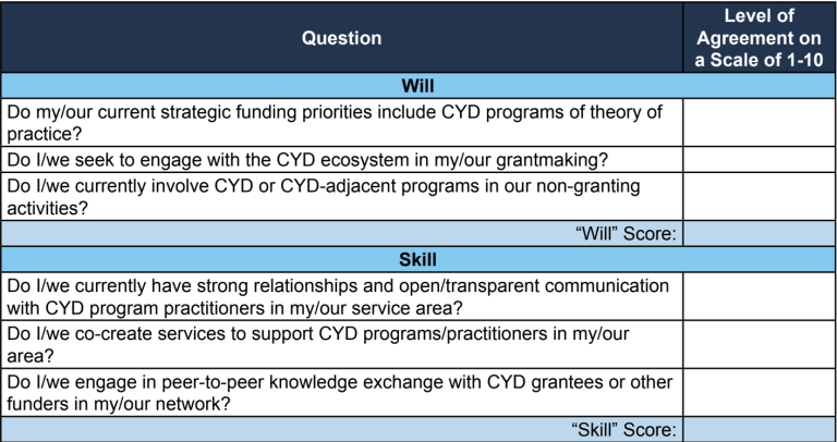Overall, the data suggests several interwoven trends in behavior of funders in relation to their CYD program counterparts across the four categories of skill and will. Regardless of the skill or will, individuals operating within the CYD and philanthropic sectors can improve their own abilities and successfully navigate the structures that govern their work. We recognize that funding is a complex system that only moves at the speed of the individuals within it. Thus, we applaud the funders and program officers who seek to learn, understand, and grow by reading reports like this one.